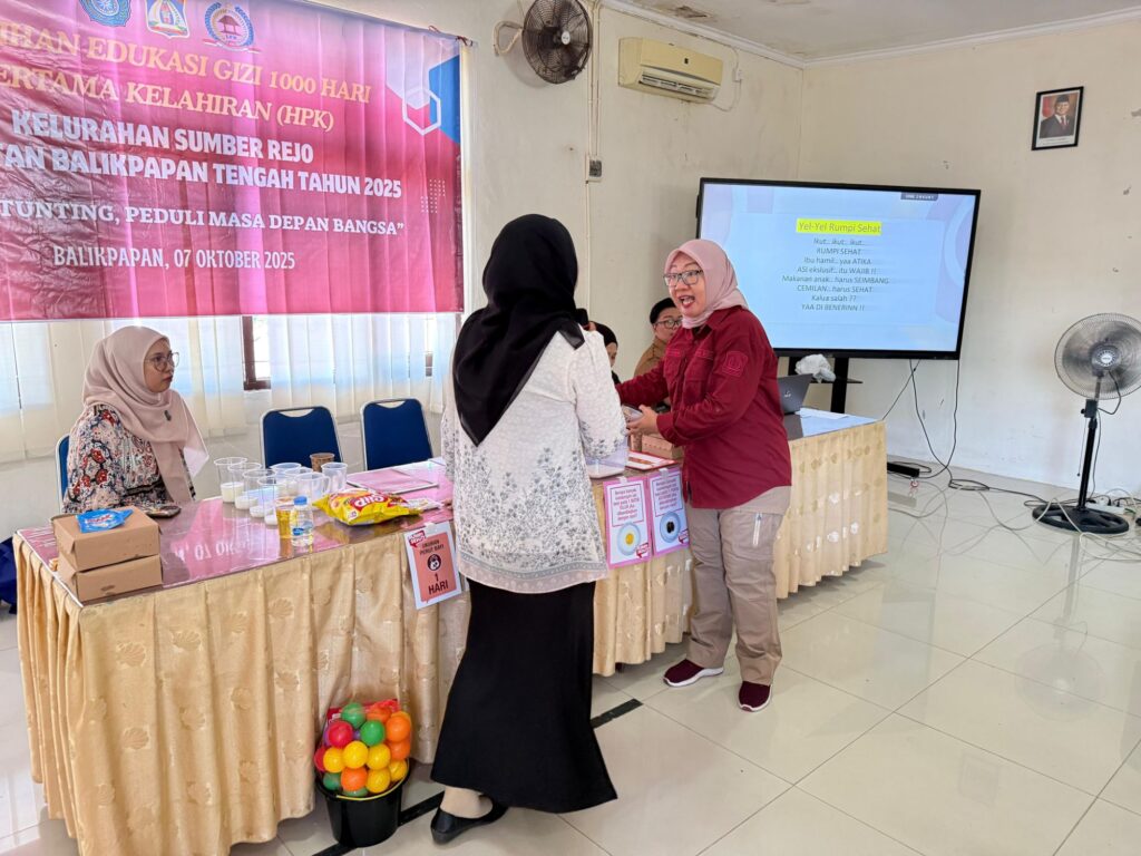 Kegiatan Pelatihan Edukasi Gizi 1000 Hari Pertama Kehidupan (HPK) yang digelar di aula kantor Kelurahan Sumber Rejo pada Selasa (7/10) menjadi bagian dari penguatan peran kader dalam mendukung program tersebut. Kegiatan diikuti 25 kader TP-PKK dan Posyandu, serta menghadirkan ahli gizi Kota Balikpapan, Irna Nur Hasana, S.G., dan Mei Amelia, S.G.