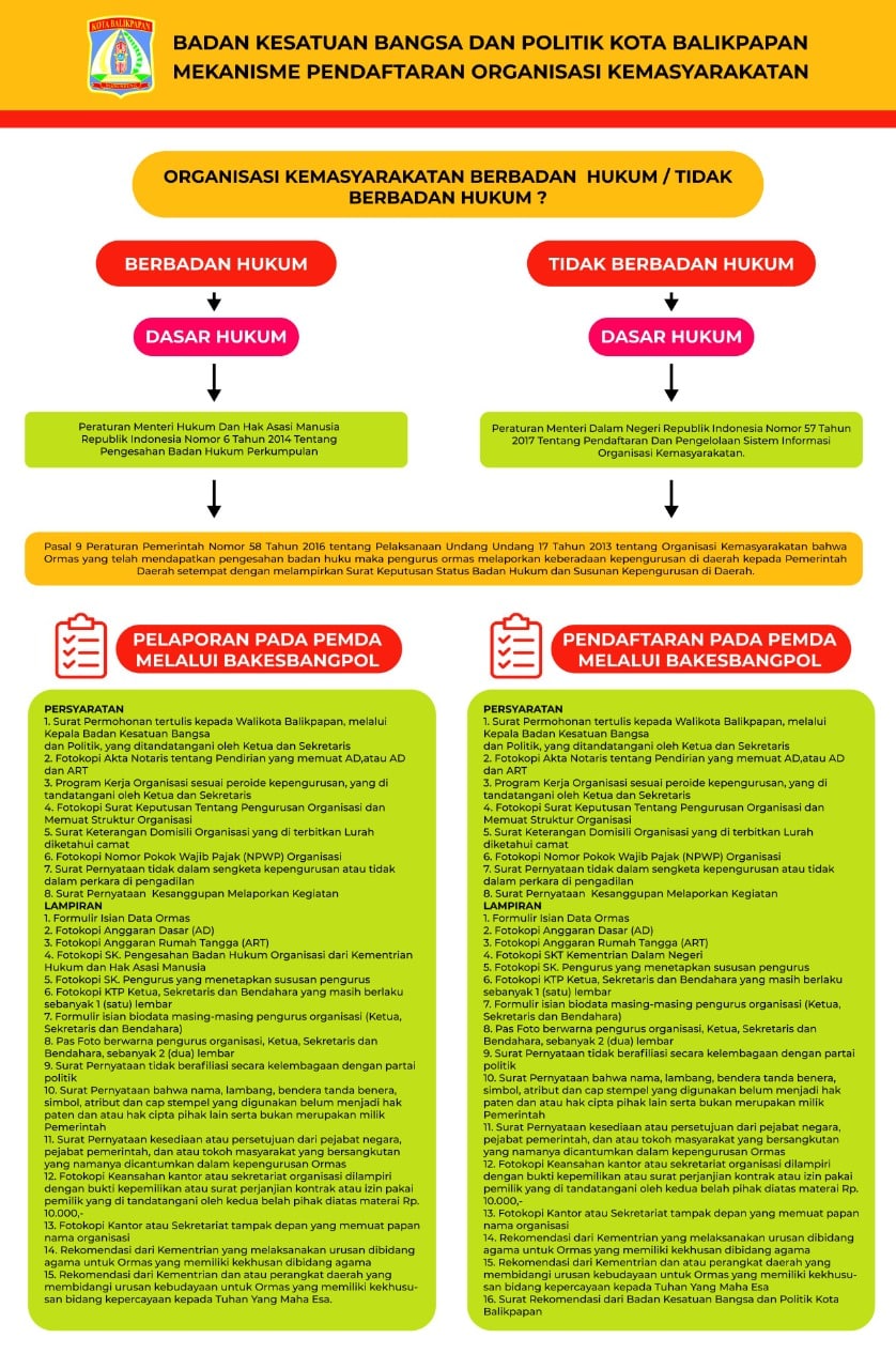 Infografis dari Badan Kesatuan Bangsa dan Politik (Bakesbangpol) Kota Balikpapan yang menjelaskan mekanisme pendaftaran organisasi kemasyarakatan, baik yang berbadan hukum maupun tidak berbadan hukum. Melalui panduan ini, diharapkan setiap Ormas dapat memahami dasar hukum, persyaratan, serta prosedur pelaporan atau pendaftaran secara tepat melalui Bakesbangpol. (Deb)